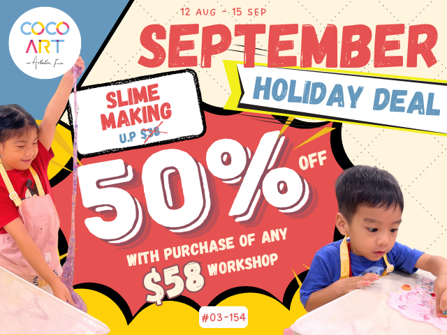 50% off slime making with purchase of any $58 workshop. Not valid with other ongoing promotions, membership privileges, discount cards or vouchers. Redemption is only valid at CocoArt Marina Square.