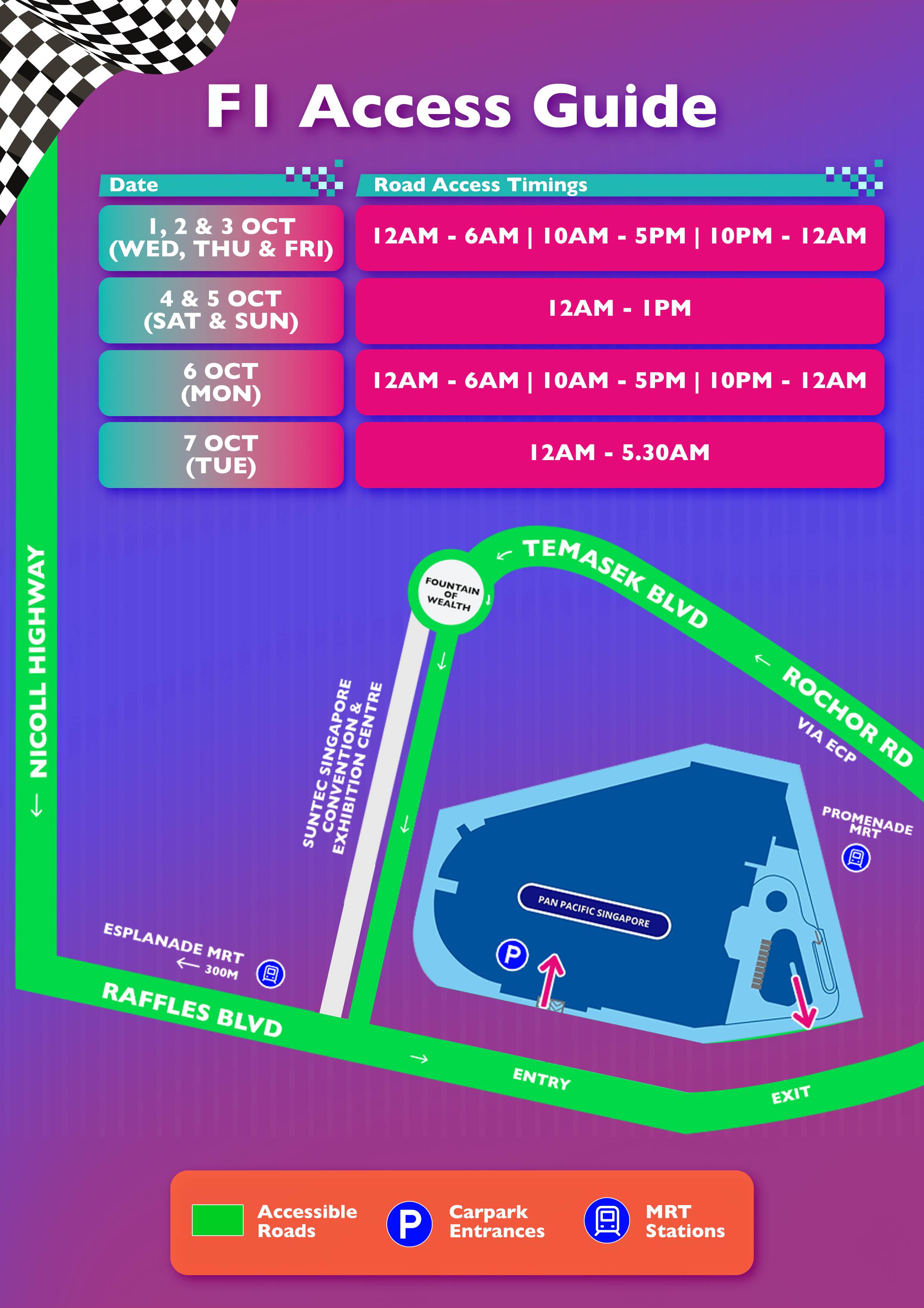 Vehicles entering Marina Square from 1 to 7 October, kindly note that the carpark entries and exits via Raffles Avenue are temporarily not accessible. Vehicles can enter Marina Square Carpark via a single lane access along Raffles Boulevard via Nicoll Highway or Temasek Boulevard during the stipulated timings and exit via Pan Pacific Hotel Carpark.