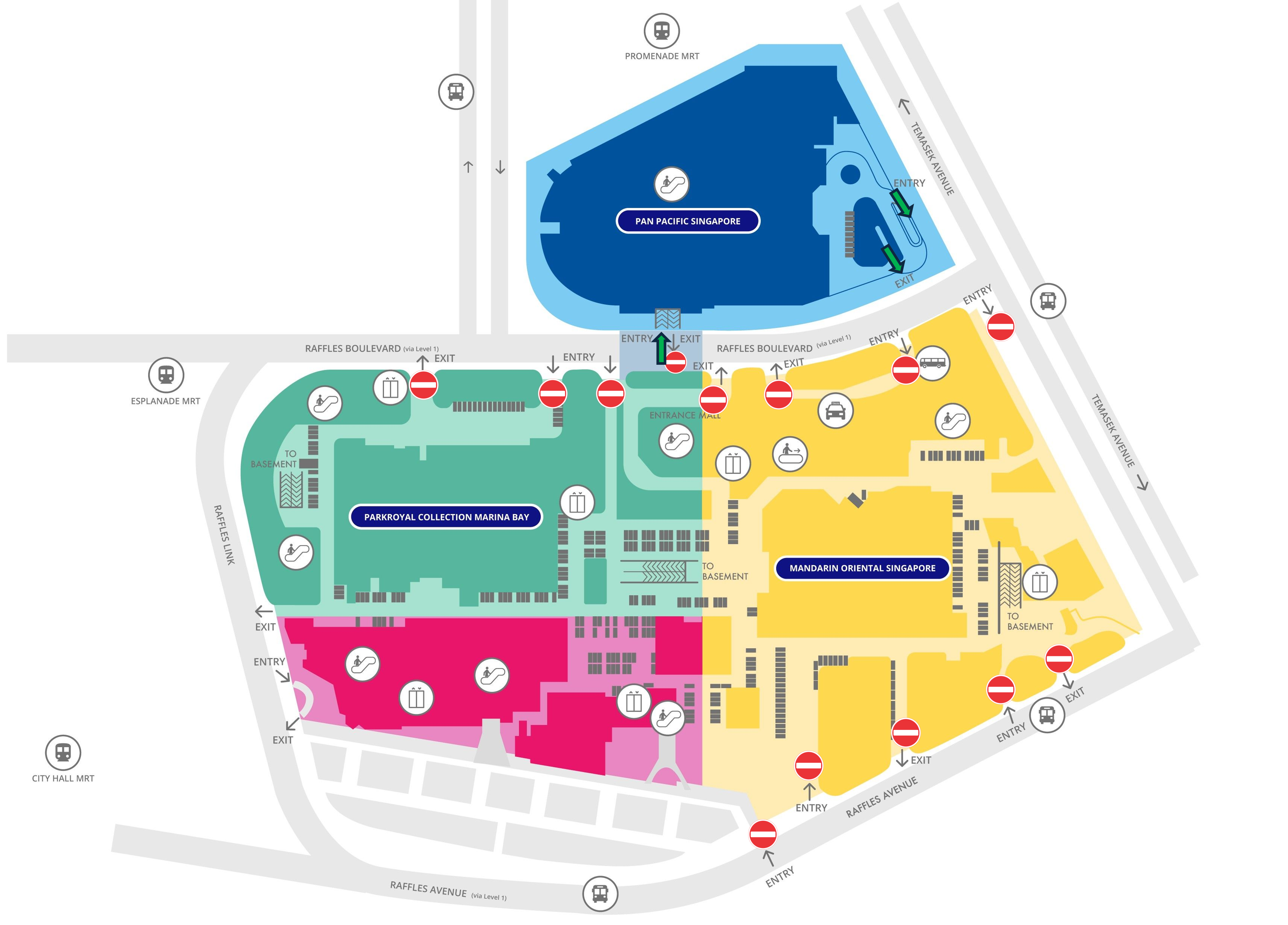 Taxis may access our temporary drop-off point at B1 blue zone (near Pan Pacific Hotel) during mall operating hours. The drop-off point will close at 9.30pm. Kindly note that the nearest Taxi Pick up point is located at Suntec Singapore Convention & Exhibition Centre at Raffles Boulevard (via Temasek Boulevard).